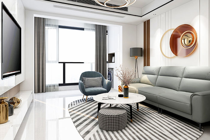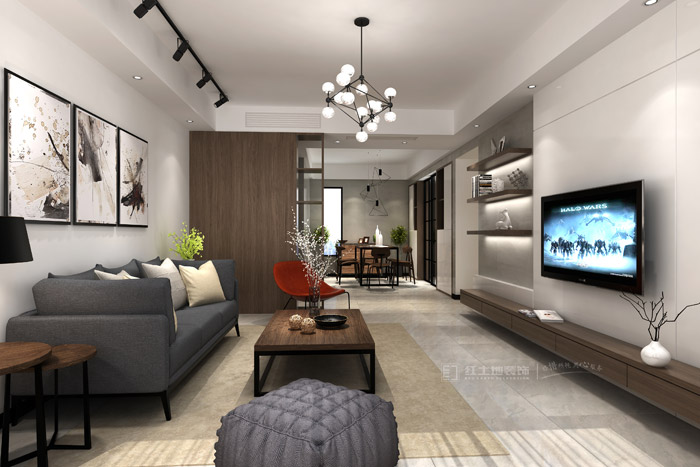 客廳以現(xiàn)代簡(jiǎn)潔的灰色調(diào)為主,4組軌道射燈+吊燈的設(shè)計(jì),有質(zhì)感的黑白灰搭配,時(shí)尚又有品位!