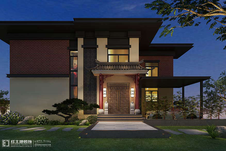 門廳對稱式的朱紅色氣派大門,庭院強調(diào)以人為本的生態(tài)理念,以自然園林為主體,借景、對景等造園手法,從門廳前庭、到過廳,內(nèi)外結(jié)合,巧妙的演繹了傳統(tǒng)中式庭院入戶的空間遞進(jìn)層次!