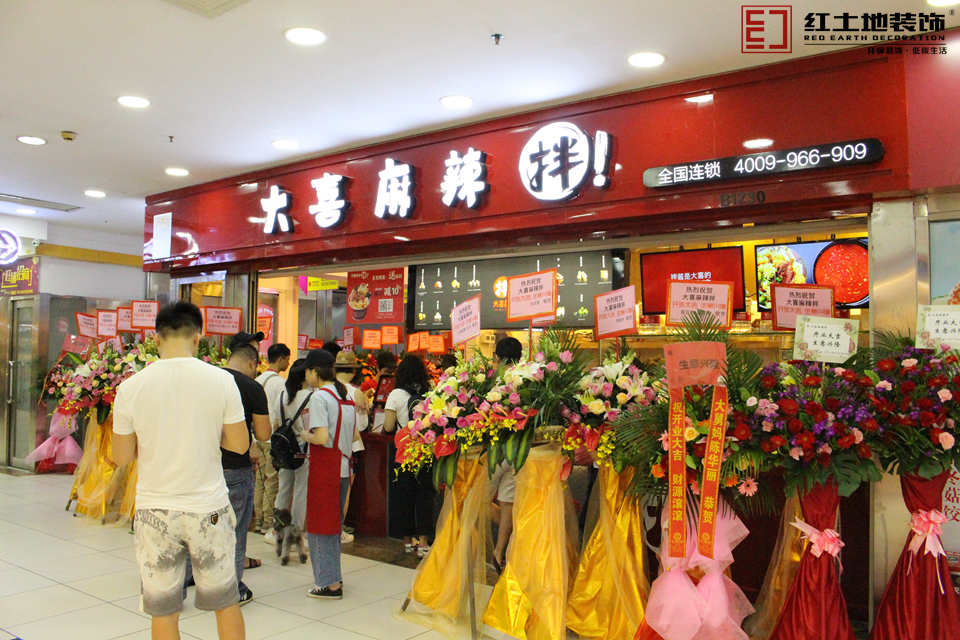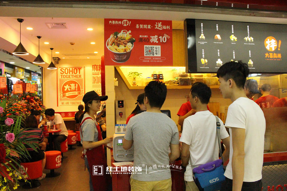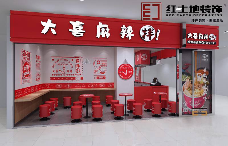 設(shè)計(jì)說(shuō)明:門面的裝修設(shè)計(jì)以中國(guó)紅為基礎(chǔ)色調(diào),簡(jiǎn)潔顯眼的紅白配色的招牌,讓顧客產(chǎn)生親近感。打破傳統(tǒng)麻辣燙的印象,運(yùn)用時(shí)尚年輕的中國(guó)紅元素,紅紅火火!融入在整個(gè)麻辣拌的空間,充滿了活力,給人以輕松、快樂(lè)、放心的感覺(jué)。店內(nèi)用紅色的桌椅、明亮的燈光,大面積的大喜麻辣拌LOGO牛皮紙,很容易讓人眼前一亮,又與連鎖品牌形象的作了呼應(yīng)。