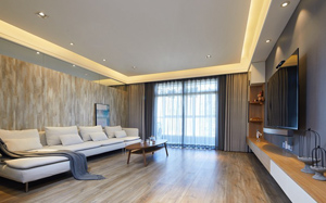 珠??蛷d電視背景采用裝修線條,極簡的灰白空間與溫暖舒適的自然木飾面搭配。